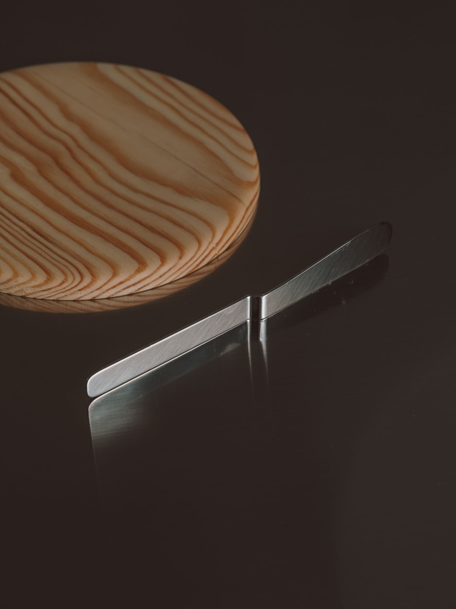 Butter knife and wooden butter platter together with Jordi Veciana and Skye Maunsell for Florentine Kitchen Knives’s The Table Knife Project. The core of the design process was about quality, functionality, visually attractiveness and efficient in its production. The result was a knife made of one piece of AISI 316 stainless steel, cut, bent and matt polished. It is neither a decorative object nor a work of art. It's a tool, functions as a knife and it’s form is self-explanatory.