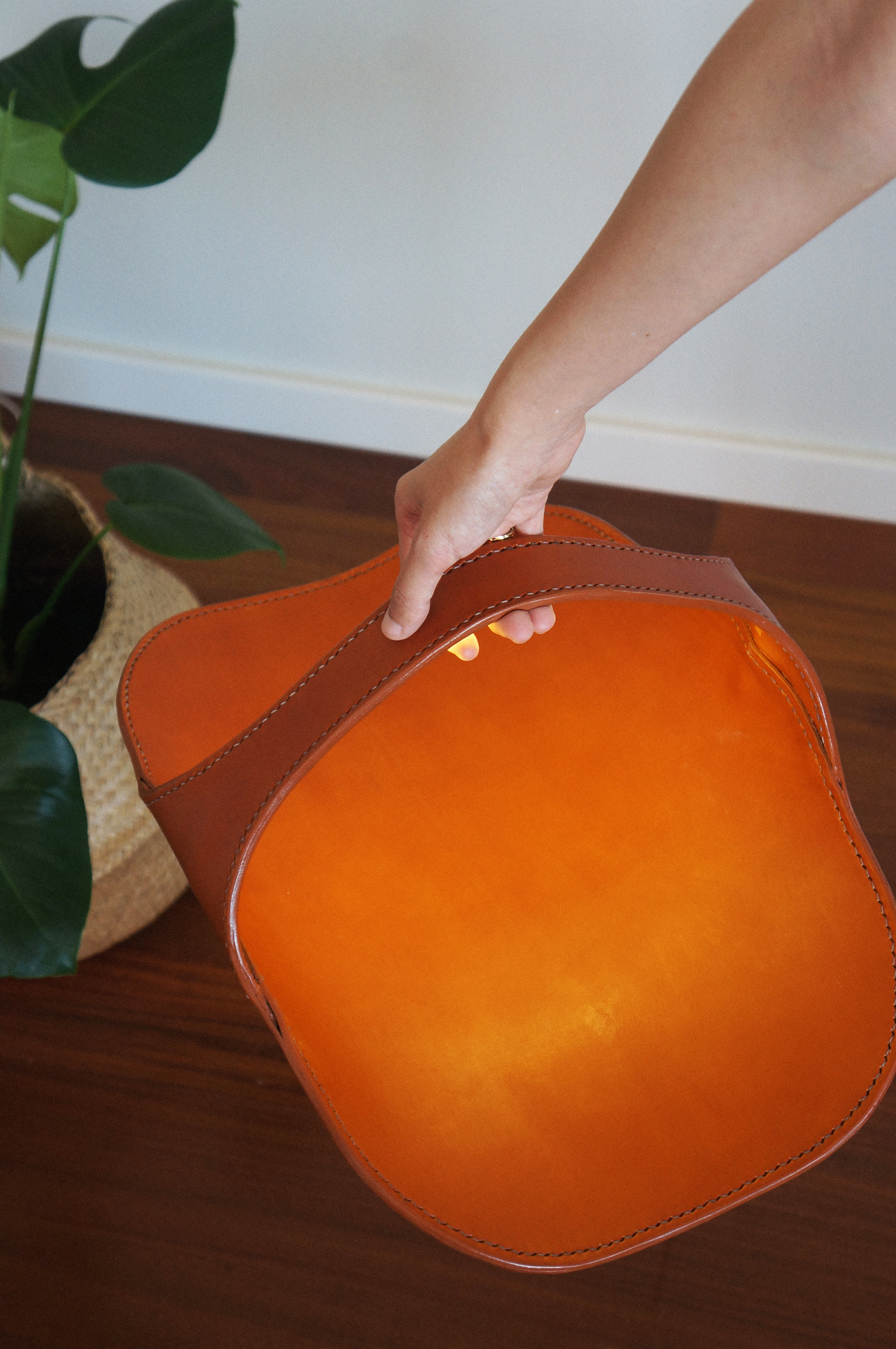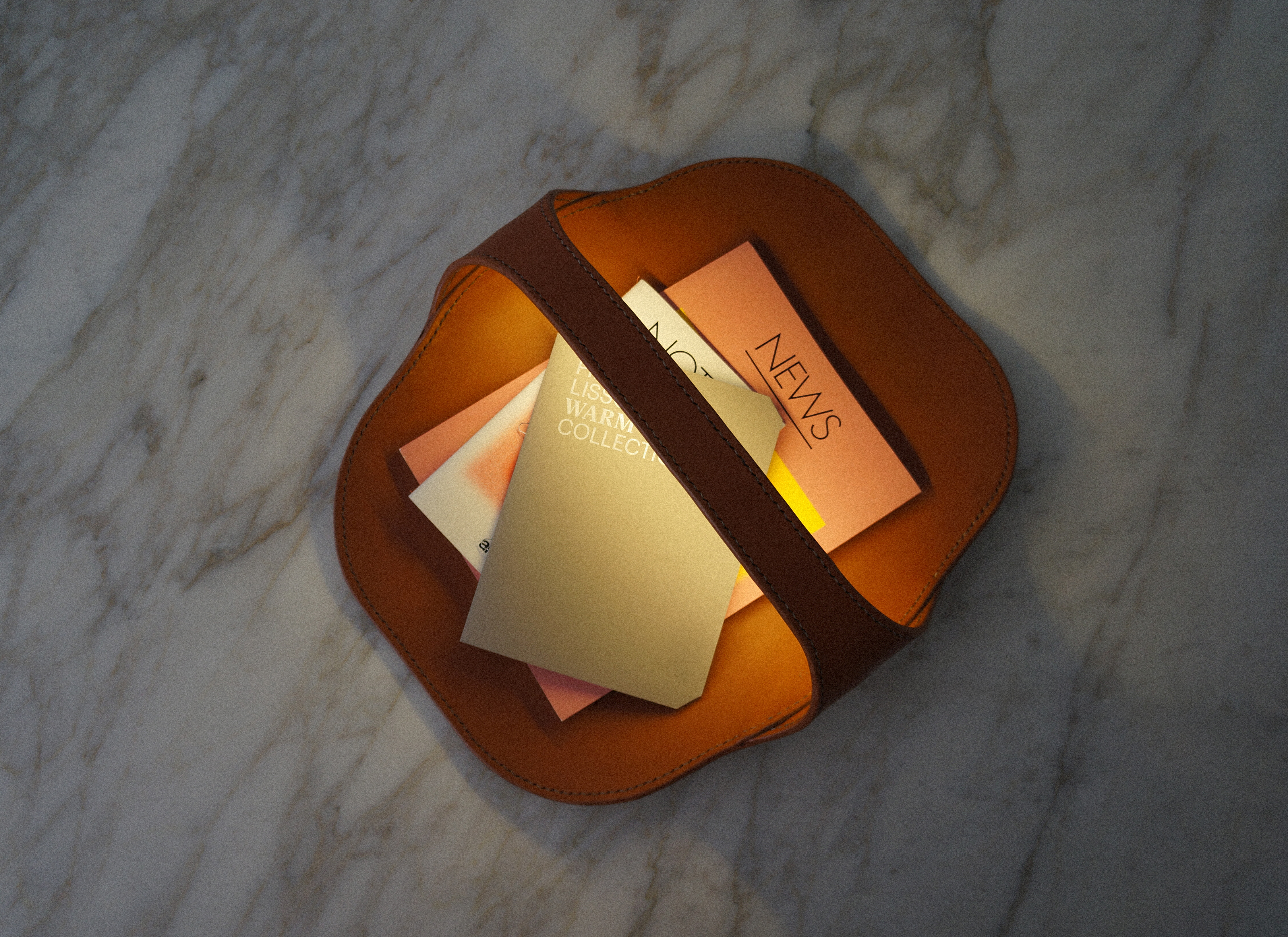 Lightapis is a basket-shaped leather lamp and a functional storage piece for the home. It serves as a pedestal for any elements placed on it, such as magazines, books, and flowers. In addition to providing light, the handle makes it easy to pick up and move the lamp from one room to another. Leather was chosen as the main material to gently diffuse a warm, delightful light, adding a beautiful gloss to all the items inside the basket. It's perfect for placement on a tabletop or resting on the floor.