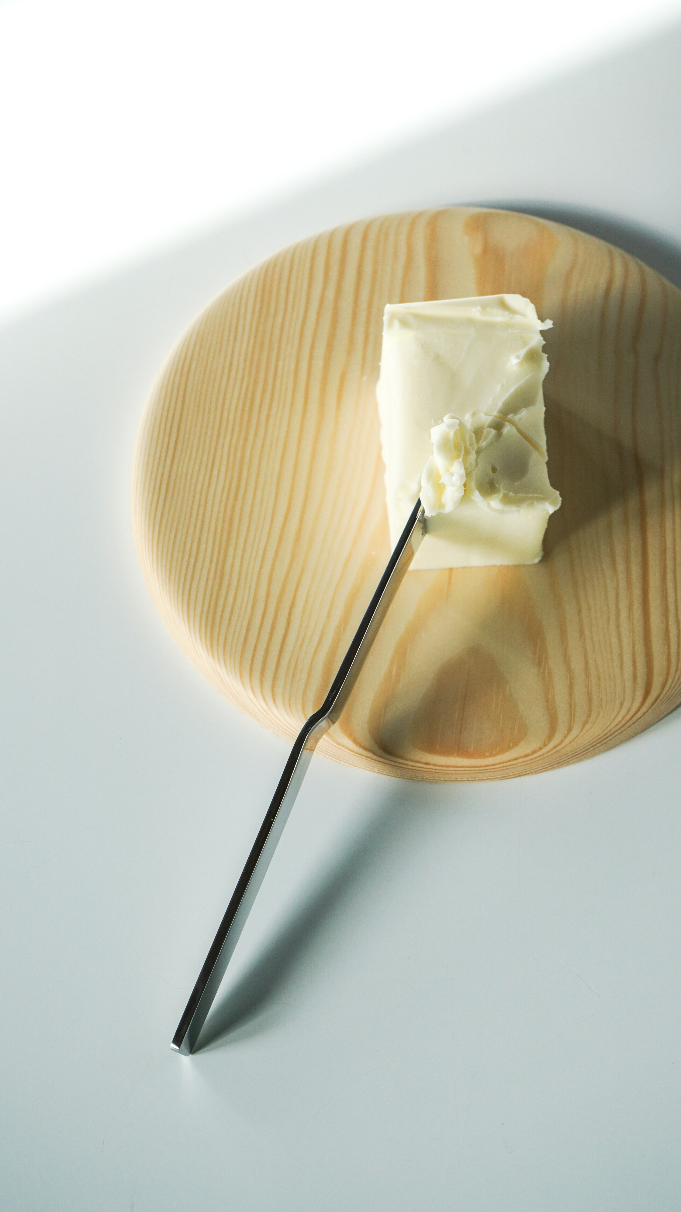 Butter knife and wooden butter platter together with Jordi Veciana and Skye Maunsell for Florentine Kitchen Knives’s The Table Knife Project. The core of the design process was about quality, functionality, visually attractiveness and efficient in its production. The result was a knife made of one piece of AISI 316 stainless steel, cut, bent and matt polished. It is neither a decorative object nor a work of art. It's a tool, functions as a knife and it’s form is self-explanatory.